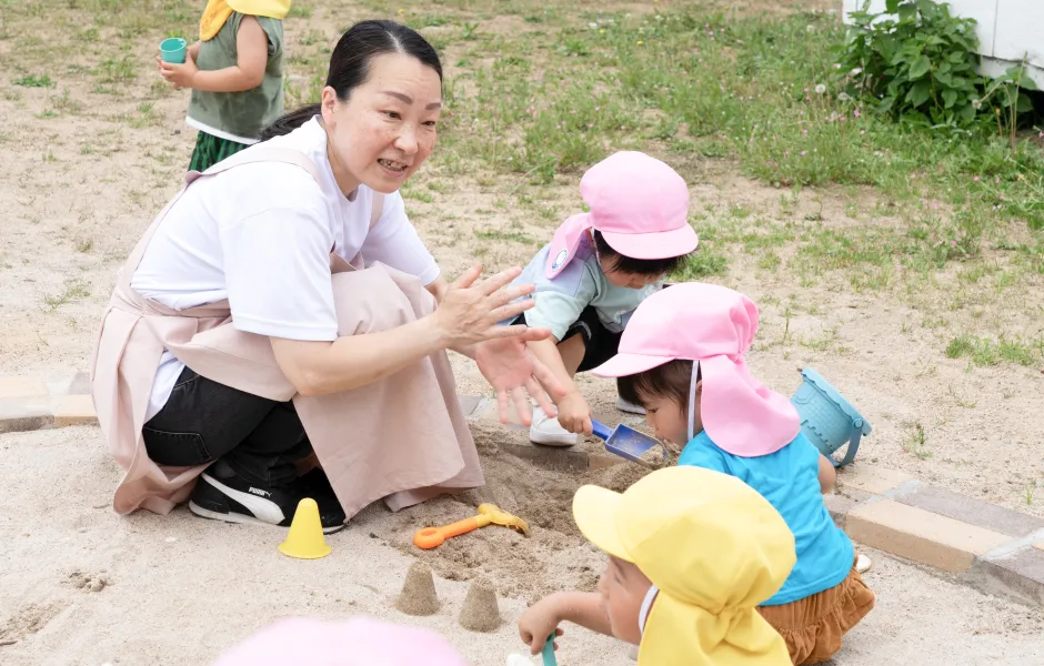 広い園庭に子どもたちの元気な声が響く保育園。 自然の中で思いきり遊ぶ体験を通して、未来を生きるための、たくましい心と体を育みます。